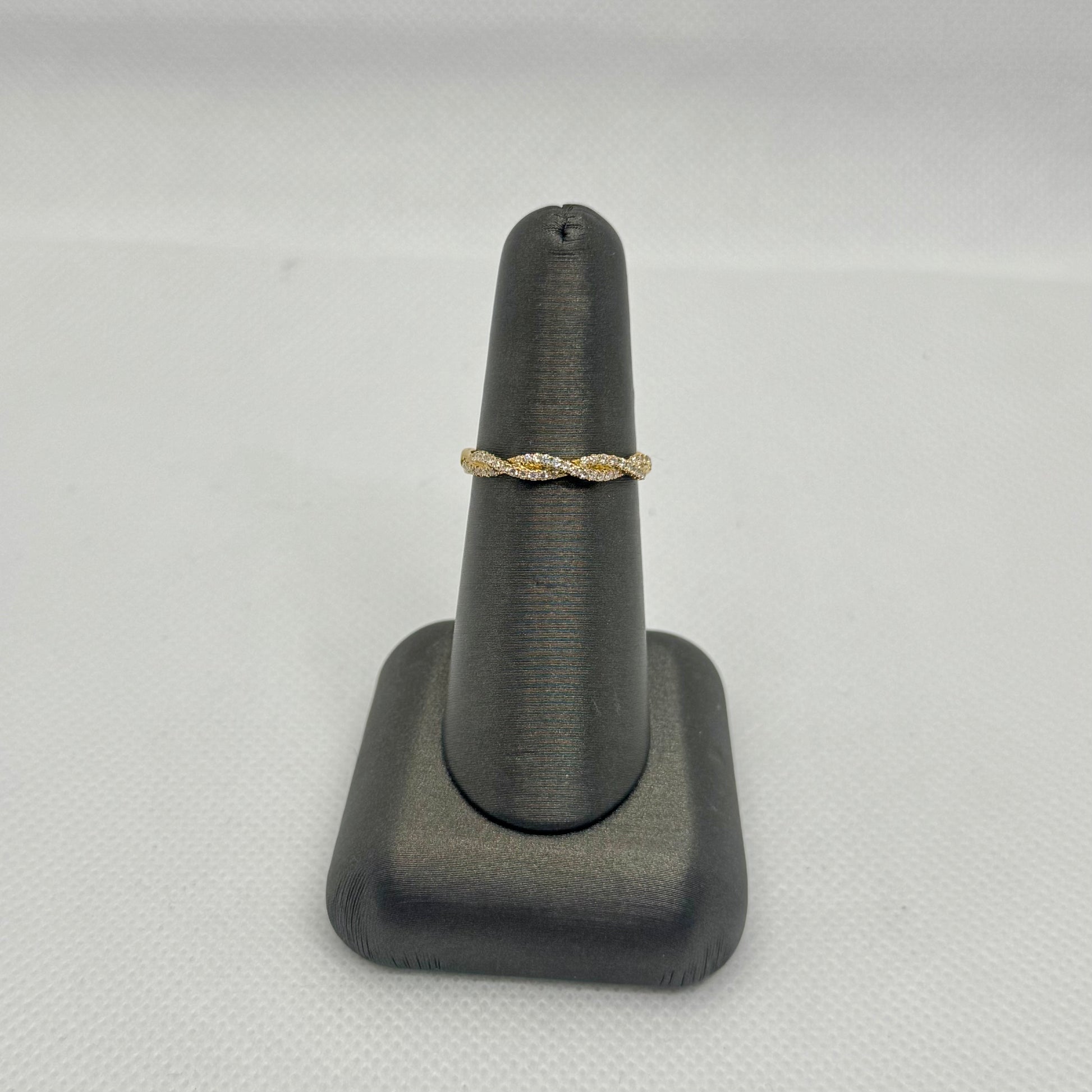 This elegant intertwining diamond band is available in 18K yellow gold, adorned with natural diamonds totaling 0.17ct, and 18K white gold, featuring natural diamonds totaling 0.11ct. Designed for a delicate yet sophisticated look, this timeless piece effortlessly blends elegance and class. Perfect for stacking or wearing alone as a refined statement.