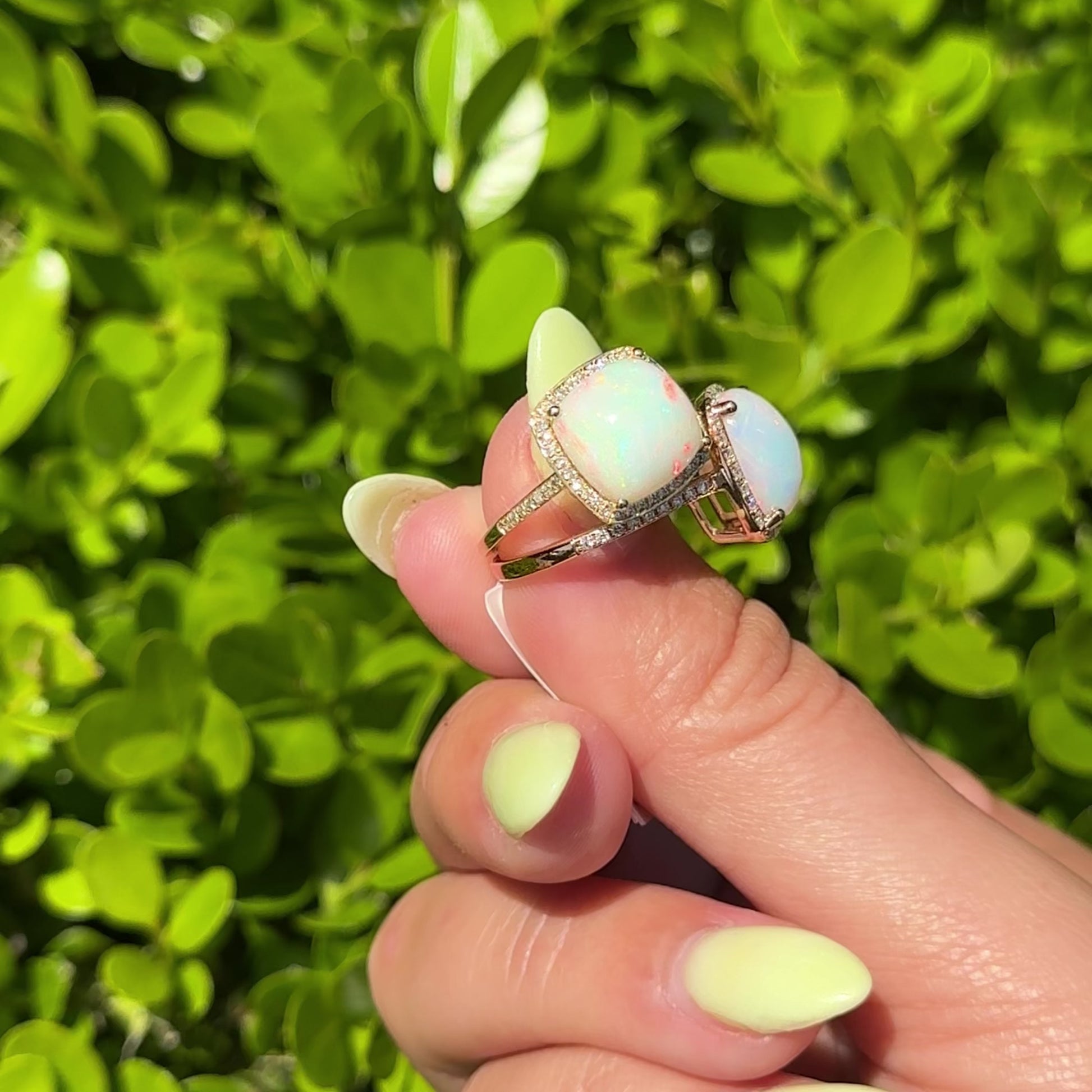 Radiate timeless beauty with this exquisite ring featuring a captivating 2.60ct opal cut gemstone set in warm, glowing 14K yellow gold. A delicate halo of natural diamonds, totaling .20ct, surrounds the opal, with additional diamonds cascading gracefully down the shank—adding brilliance and sophistication from every angle.